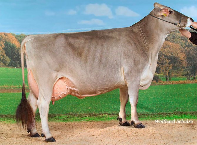 А представители мясного направления имеют довольно рыхлую мускулатуру, туловище короткое и широкое, грудь с выполненным треугольником развита довольно хорошо, вымя развито недостаточно. Животные этой породы бывают от светло-серой до темно-бурой масти. Верхняя часть туловища более светлая. Нос темно-серого цвета, вокруг него – светлые волосы. Швицкая порода довольно широко распространена но всему миру благодаря своим высоким продуктивным качествам.