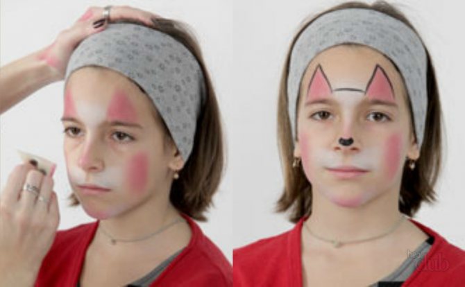- Однотонное лицо. Его можно выполнить, например, при помощи тонального крема или пудры. Этот элемент не обязателен (детское лицо им лучше не перегружать). Однако он, бесспорно, сделает образ реалистичней. На этом этапе можно подчеркнуть румянами щеки, сделать их округлыми. Для этого подойдёт коричневый или тёмно-бежевый тон.