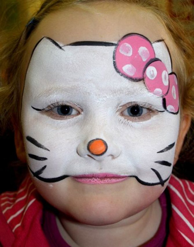 Многие девочки любят мультик Хелло Китти. И даже тем, кто его ни разу не смотрел, знакома милая белая кошечка – главный герой. Кто сказал, что макияж должен быть реалистичным? Девочка будет рада, если у нее на лице нарисуют мордочку кошки Кити.