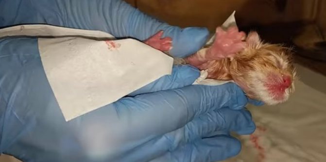 - В первую очередь необходимо освободить котенка от оболочки, это позволит ему самостоятельно дышать.