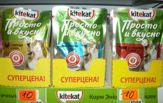 продаются в пакетах-паучах по 100 г и 85 г, а также в железных банках по 410 г. Корма этой марки можно купить практически повсеместно, цена на продукты «Kitekat» невысокая (около 16 рублей за 100 г влажного корма и 50 рублей за 350 г сухого).
