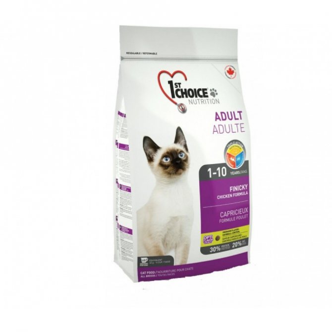 1st Choice FINICKY — привередливым кошкам: со свежем курицей и сельдью. Компоновка жиров, углеводов и белков идеальна, pН максимально сбалансирован.