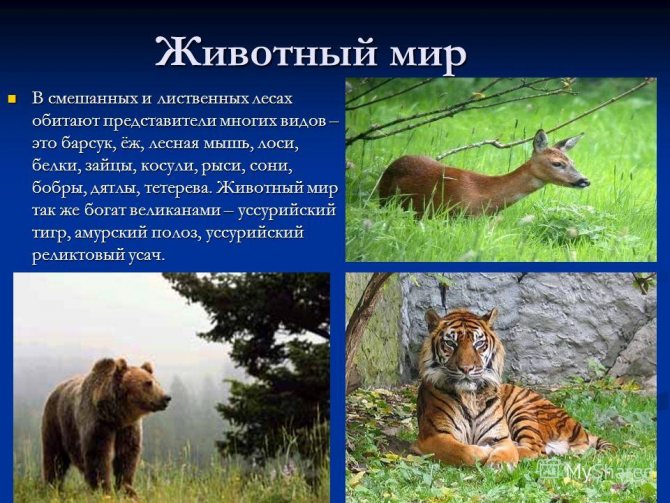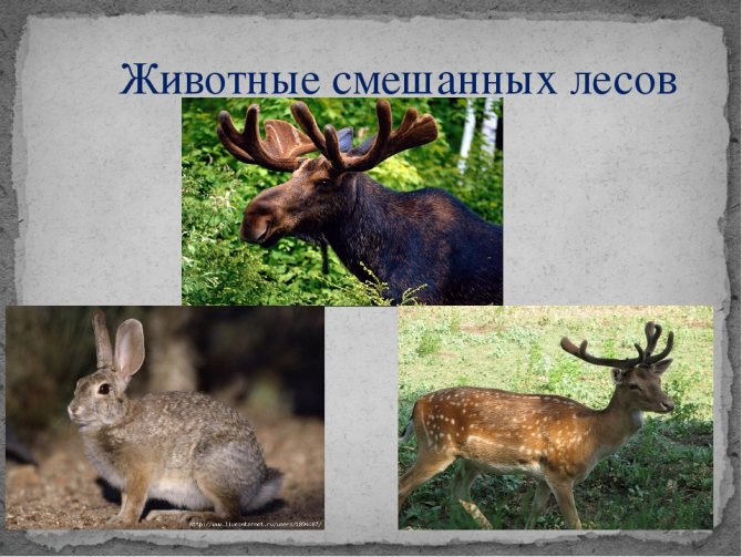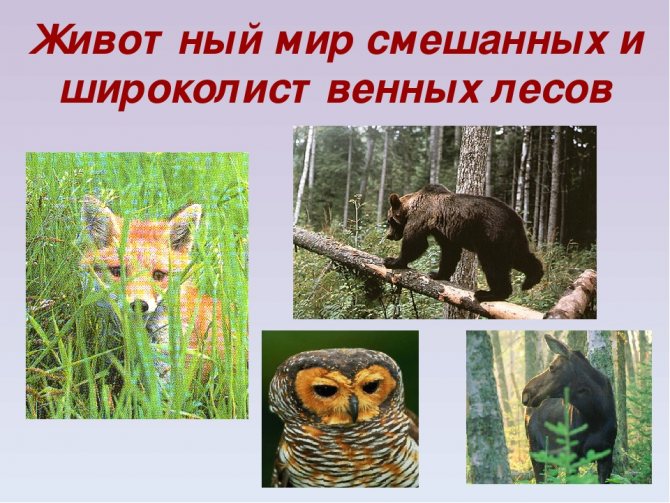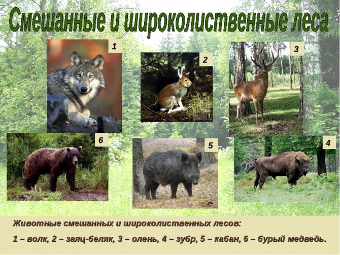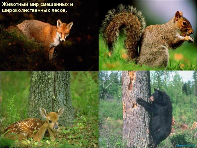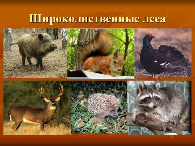 Для Северной Америки привычны такие обитатели, как дикие индейки, серые и черные белки, медведи барибалы, виргинские олени, канадские бобры, американские дрозды, славки, красноглазые виреоны, сурки, виргинские опоссумы. Животные широколиственных лесов России и Европы – это олени маралы, бурые медведи, лисицы, горностаи, барсуки, енотовидные собаки, лоси, зайцы, волки. В Южной Америке обитают пумы, пуду, чилийские кошки. В Азии и на Дальнем Востоке типичные животные зоны широколиственных лесов – россомахи, олени, енотовидные собаки, изюбри, маньчжурские зайцы, горалы, харзы. Здесь также обитают краснокнижные амурские тигры и дальневосточные леопарды.