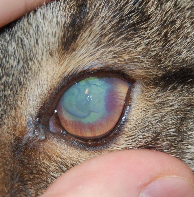 В большинстве случаев герпесвирусная инфекция осложняется вторичной микрофлорой, что может приводить к расплавлению роговицы, возникают глубокие иногда прободные язвы с пролапсом радужной оболочки, в дальнейшем может развиться панофтальмит, вторичная глаукома или субатрофия глазного яблока. Агрессивное течение герпесвирусной инфекции – основная причина потери глазного яблока у котят.