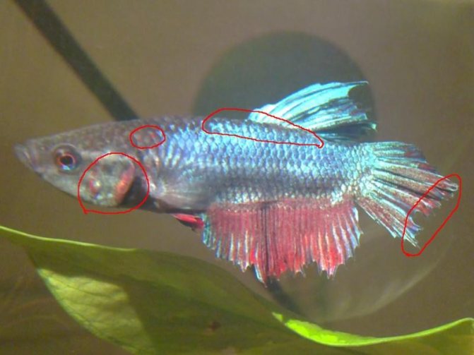 - образование язв на теле в месте, где ранее были плавники – патологией затрагивается мышечная и кровеносная системы, и лечение в такой ситуации уже бесполезно;