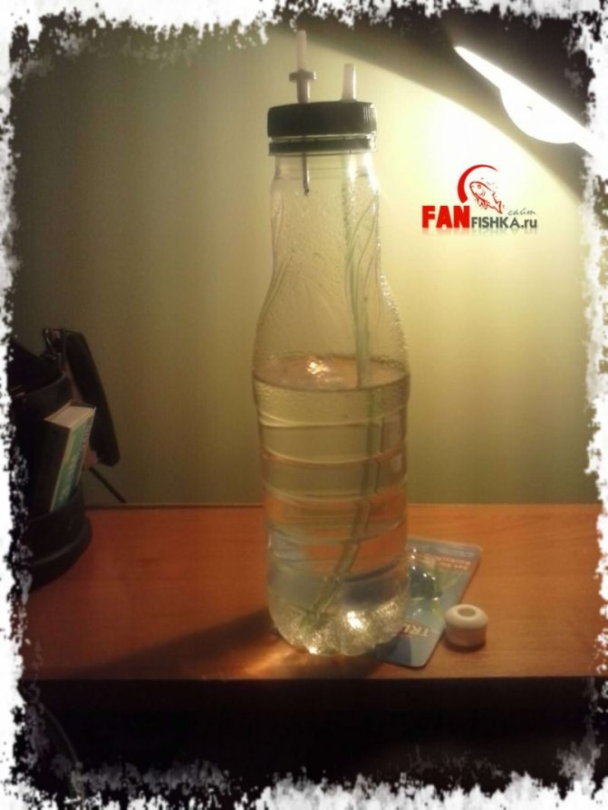 Литровая бутылочка из под сока с широким горлышком. Например, из под сока «Биола». Используется в качестве своеобразного фильтра, дабы бражка и сопутствующая ей бяка не попали в аквариум. Стоимость 1$.