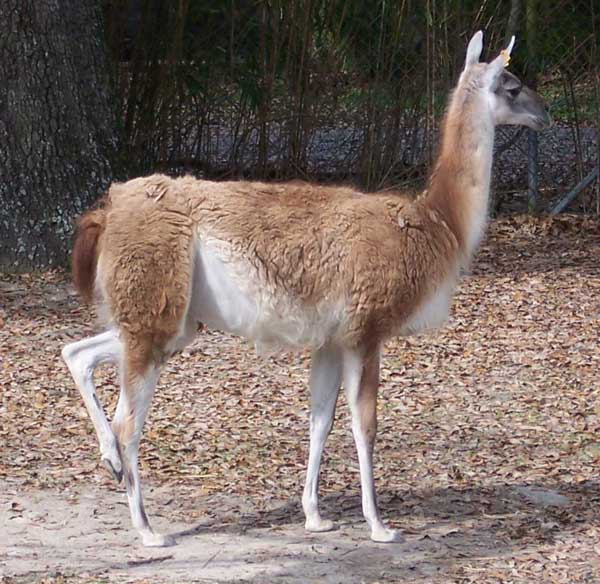 Хвост очень короткий, постоянно поднят вверх. Верхняя часть хвоста покрыта волосами, нижняя – почти голая. Длина тела гуанако – 1,2-1,75 м, высота в холке – 0,9-1,3 м, масса – 115-140 кг, длина хвоста – 15-25 см. На двупалых конечностях сохранились только третий палец и четвертый. Ступни подвижные, узкие, глубоко расчлененные между пальцами.
