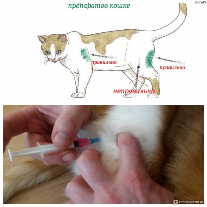 Инъекции медикаментом делаются внутримышечно. В некоторых случаях ветеринар назначает подкожное введение, однако при такой технике повышается риск развития воспалительного процесса в зоне укола.