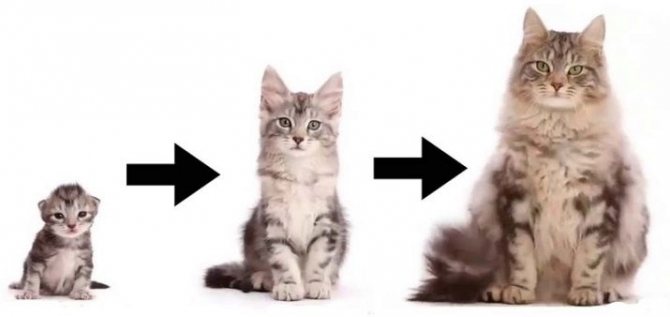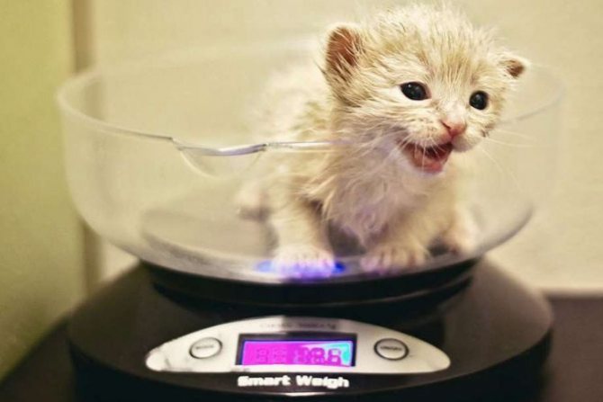 В среднем новорожденный котенок весит 70–130 г. До 1 месяца он прибавляет около 15 г в день, достигая к концу этого срока 500–750 г. До 2 месяцев вес малыша еженедельно увеличивается на 100–150 г, к 8 неделям вес составляет 1–1,6 кг. Дальнейшие показатели зависят от питания, образа жизни и породы. В среднем 3-месячное животное весит 1,5–1,8 кг, 6-месячное – 2,6–3,6. Вес в 1 год – 3,15–4,6.